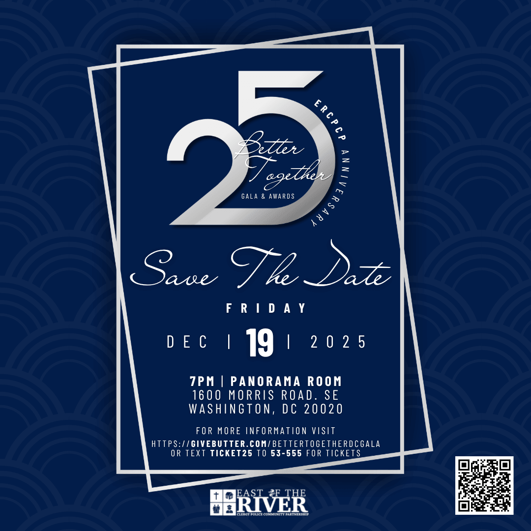 - ERCPCP 25th Anniversary Gala: Better Together in 2025 - The East of the River Clergy Police Community Partnership (ERCPCP) is celebrating 25 years of transformative work with the Better Together Gala & Awards. This event honors the power of collaboration in improving public safety and youth outcomes in Washington, DC.